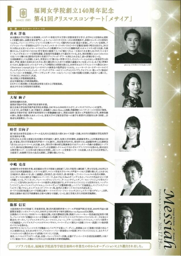 福岡女学院創立140周年を記念して贈る第41回クリスマスコンサート「メサイア」。ヘンデルの名作を福岡女学院メサイアオーケストラと合唱団が余すところなく演奏し、青木洋也氏の指揮のもと、大塚絢子氏、時任日向子氏、中嶋克彦氏、篠部信宏氏らソリスト陣が豊かな歌唱を繰り広げる。指揮の青木氏はカウンターテナー・ソロも務め、男性合唱団を含め、福岡女学院合唱団が壮大なコラールを彩る。荘厳かつ華麗な演奏でクリスマスを祝う。