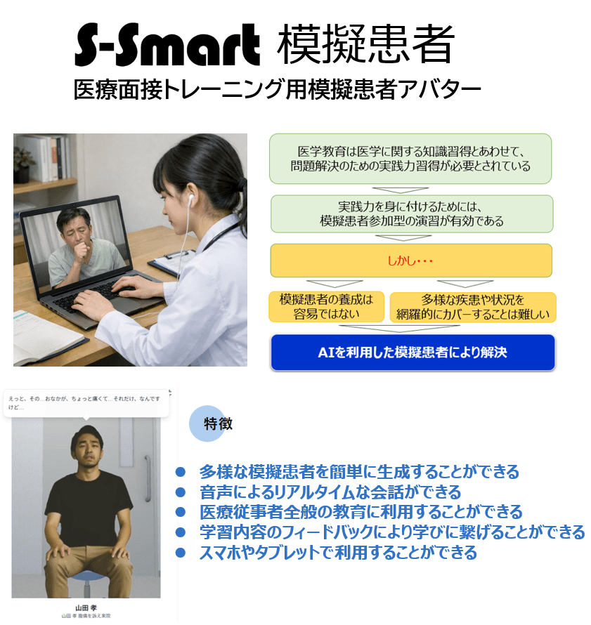 駒澤大学(東京都世田谷区/学長:村松哲文)グローバル・メディア・スタディーズ学部の小林透教授と、長崎大学(長崎県長崎市/学長:永安 武)の研究グループは2024年から株式会社システック井上(長崎県長崎市/代表:井上達氏)とともに生成AIを活用した「模擬患者アバター」に関する共同研究に取り組んできました。このたび、主要な研究開発が完了し、3月26日(木)には研究成果の発表会を執り行います。なお、この模擬患者アバターは、「S-Smart模擬患者」としてシステック井上から販売予定で、すでに2つの大学で導入が検討されています。