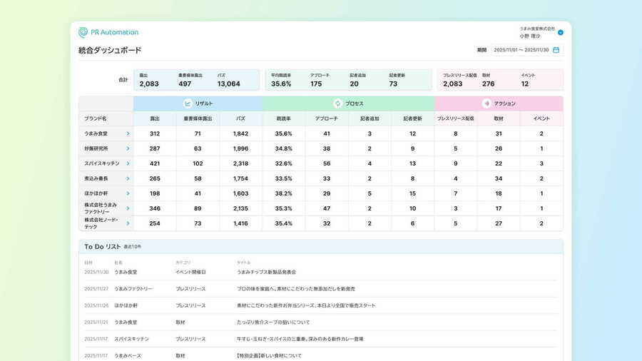 広報・PRのデジタルトランスフォーメーション(DX)を推進するプラップノード株式会社(本社:東京都中央区、代表取締役 CEO:渡辺幸光)は、統合型広報DX支援ツール「PRオートメーション」を2026年4月1日にリニューアルしました。今回のリニューアルにより、UI/UXの刷新、AIによるリリース作成支援、マルチブランド機能、Webクリッピング頻度の向上などを実現し、広報業務全体を管理しやすく、活動と成果を一連の流れとして把握しやすいマネジメントツールとして進化しています。