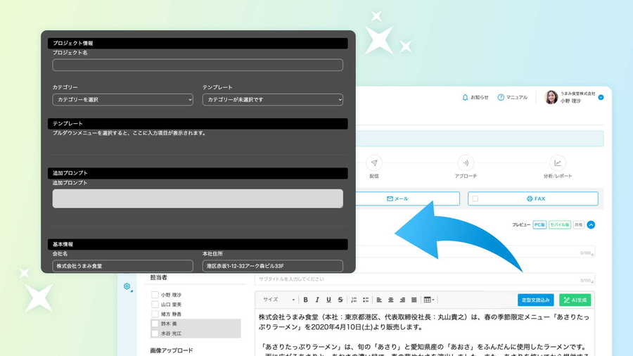 AIによるリリース作成支援機能『AI Release Maker』を実装しました。50余りのテンプレートから適切なプレスリリースを素早く生成します。生成結果はプレスリリース下書き画面へ直接挿入される動作の軽さも特徴です。