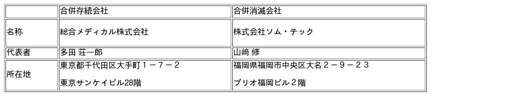 総合メディカルグループ株式会社の基幹事業を担う総合メディカル株式会社(本社:東京都千代田区、代表取締役社長:多田 荘一郎、以下「総合メディカル」)は、2026年4月1日付で、同社の100%子会社である株式会社ソム・テック(本社:福岡県福岡市、代表取締役社長:山﨑 修、以下「ソム・テック」)を吸収合併したことをお知らせします。