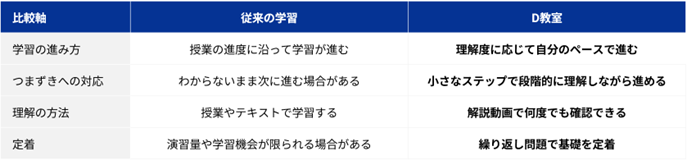 「D教室」では、まずは算数を対象に、動画による解説と問題演習を組み合わせることで、児童が自分のペースで学習を進められる環境を提供します。理解が不十分な単元にさかのぼって学び直すことや、繰り返し取り組むことができる設計により、基礎的な内容の定着を支援します。