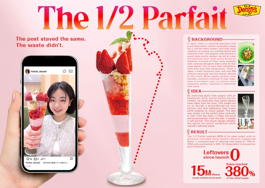 株式会社デニーズジャパン(本社:東京都千代田区、代表取締役:小松雅美)が運営する「デニーズ」において、この度、『まっぷたつ?パフェ』(英題:“The 1/2 Parfait”)が、 「Spikes Asia 2026」においてDesign部門でブロンズを受賞しました。また、Brand Experience & Activation部門でもショートリストに選出されました。