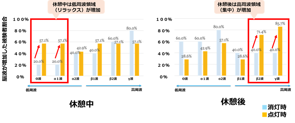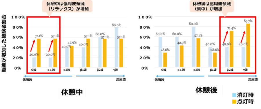 リラックス状態の休憩を経た後の作業時において、覚醒や集中に寄与する⾼周波帯域(β2 波、γ波)が増加した被験者の割合も消灯時に⽐べて顕著に上昇しました。β2 波では消灯時40.0%から点灯時71.4%、γ波では消灯時40.0%から点灯時85.7%まで上昇しています。