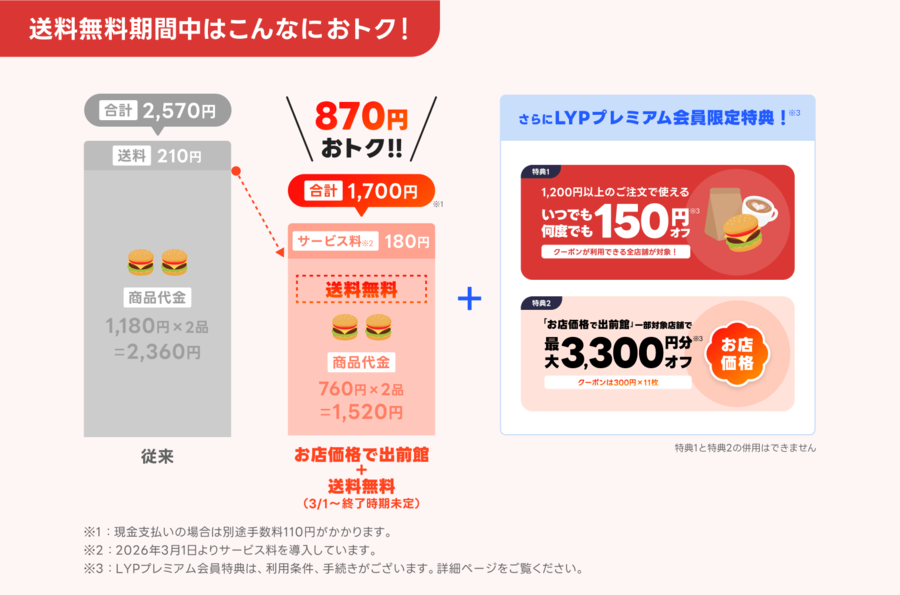また、3月よりご好評いただいている送料無料(出前館がお届けする店舗に限る)と、LYPプレミアム会員限定の特典提供を継続、さらに抽選で豪華クーポンが当たるSNSキャンペーンも実施します。