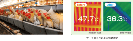 アキレスの畜舎用断熱材「トリトン」は、特に夏場、屋根からの熱侵入量を8割以上カット。サーモカメラによる測定では、断熱材なしの屋根表面温度47.7℃に対し、トリトン施工後は36.3℃と、約11℃の差が確認されました。