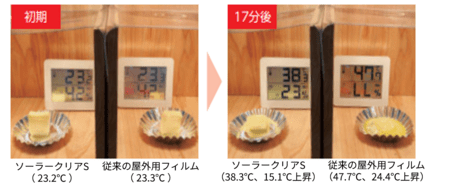 ソーラークリアSを貼った箱と従来の屋外用フィルムを貼った箱に温度計とバターを設置し、熱源ライトを照射しました。17分後、従来の屋外用フィルムは箱内が24.4℃上昇しバターが溶融。一方、ソーラークリアSを貼った箱は15.1℃の上昇に抑えられ、バターも形を保ちました。見た目ではほとんど違いがないフィルムが、これほどの差を生み出すのです。