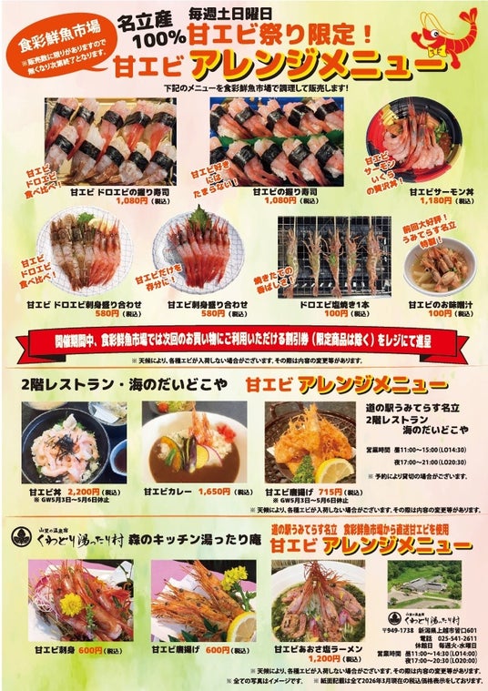 互恵グループの株式会社ゆめ企画名立(新潟県上越市 代表取締役:細谷 貴雄)が運営する「道の駅 うみてらす名立(新潟県上越市)」は、名立漁港で水揚げされた新鮮な甘エビを楽しめる「名立産100%甘エビ祭り 第2回」を、2026年4月4日(土)~5月31日(日)の期間中、毎週土日に開催いたします。