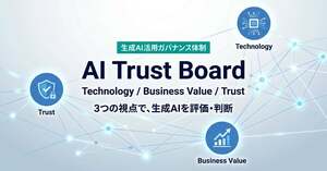 生成AIの社会実装が急速に進む一方で、企業においてはデータ利用やセキュリティ、透明性、説明責任などの観点から、導入やサービス提供の判断に難しさが生じています。当社はこうした課題に対応するため、生成AIを活用したプロダクトやサービスについて、「Technology」「Business Value」「Trust(信頼性)」の3つの観点から評価・判断を行う意思決定体制を整備しました。生成AIを技術視点や事業価値視点だけでなく、「社会や顧客に安心して利用され続けるか」というTrust(信頼性・透明性・説明責任)の観点からも評価・判断する体制を整備し、スピードと信頼性を両立した生成AI開発と活用を推進してまいります。