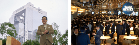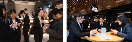 また第2部では、歓迎会に参加しているグループ会社の全新入社員784名が、アジア初上陸の大規模フードマーケット「タイムアウトマーケット大阪」に集結し、交流会を実施。ランチ会や自身の「幸せを感じる瞬間」を記載したこの日限りのオリジナル名刺の交換会を通じて、部署や地域を越えたつながりが生まれ、新入社員同士の一体感を育むカジュアルな交流の場となりました。