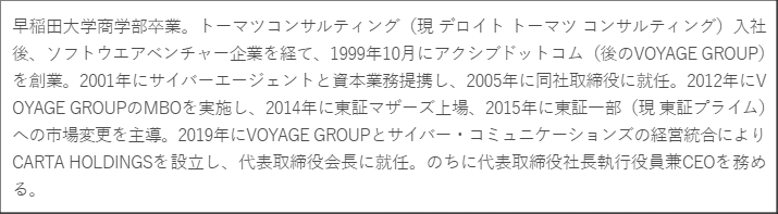 宇佐美進典氏は、インターネットおよびデジタルマーケティング領域において、20年以上の経営経験を有する起業家・経営者です。1999年にVOYAGE GROUPを創業し、MBOの実施や2014年の東証マザーズ上場、2015年の東証一部への市場変更を主導しました。2019年にはCCIとの経営統合を通じてCARTA HOLDINGSを設立し、代表取締役会長(のちに代表取締役社長執行役員兼CEO)を務めました。当社においても、同氏がこれまで培ってきた事業機会の創出・成長支援、資本市場戦略、ならびに上場後のガバナンス体制構築に関する知見を活かし、貢献いただくことを期待しています。