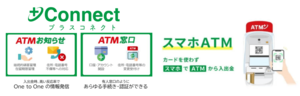 「+Connect」(プラスコネクト)はあらゆる手続き・認証をセブン銀行ATMで実現するサービスの総称です。その中に、お客さまがATMで取引きを行う際に、お客さまにお知らせしたい情報をATM画面に表示し、回答を収集する「ATMお知らせ」サービスと、これまで対面で行う必要のあった各種手続きを、原則24時間365日行うことができる「ATM窓口」サービスがあります。