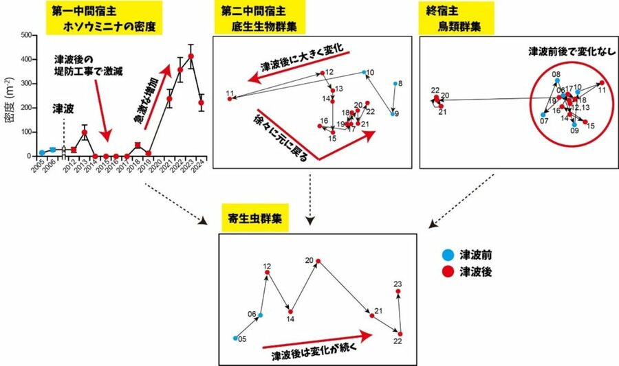 東日本大震災に伴う大津波が東北地方を襲ってから、15年の歳月が流れました。海岸に積みあがった瓦れきの山はすでになくなり、海岸の風景も一見すると平穏を取り戻したかのように見えます。これまでの研究により、海岸の生物は津波により大きな影響を受けたことが明らかにされてきました文献1、2。しかし、津波が海岸生態系に与えた影響について長期的な視点から調べた研究は限られており、海岸の生物がどれくらいの時間をかけてどれ程までに回復したのかについては不明な点が多く残されていました。特に、複数の宿主を渡り歩く生活史をもつ寄生虫は、生活史の中の宿主が一つでも欠けると子孫を残すことが難しくなるため、津波の影響をより強く受けることが予想されます。本研究では、寄生虫を含めた干潟生態系が津波によってどのような影響を受け、そしてどれくらいの時間をかけて津波前の状態へと戻っていくのかを震災前を含む約20年間の長期にわたり調べました。