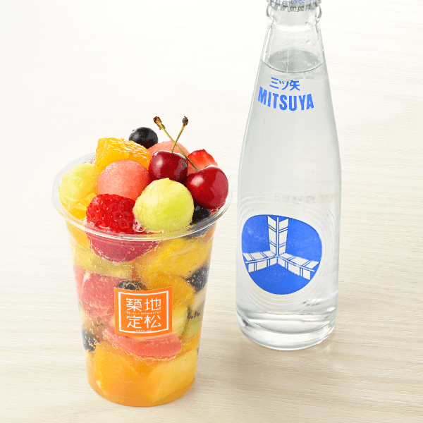 築地定松こだわりのカットフルーツに、瓶入りサイダーをセット。シュワッと注いでフルーツポンチが完成します。