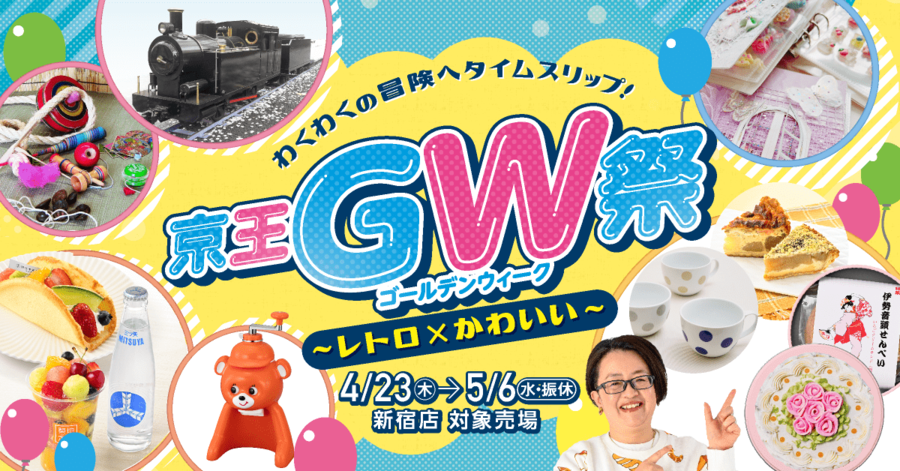 京王百貨店 新宿店では、4月23日(木)~5月6日(水・振休)の期間、「京王GW祭~レトロ×かわいい~」を開催します。毎年、大人から子どもまで楽しめるポップアップイベントやワークショップなどを開催する「京王GW祭」。今年は「レトロ×かわいい」をテーマに、懐かしの屋上遊園地や昭和から愛される名店グルメ・スイーツ、平成女児ブームとして話題の “シール帳”が作れるワークショップなど、大人にとっては懐かしく、子どもにとっては新しいイベントやグッズがそろいます。さらに期間中は、7階大催場で開催する「スイーツ&パン博」にて中田ぷうさん監修 「Keio 缶フェス」を展開することから、お菓子缶研究家・中田ぷうさんが館内ショップからレトロかわいいアイテムを厳選した特別企画「中田ぷうさんのお気に入り!」を展開。7階大催場「スイーツ&パン博」と対象ショップの買い回りで楽しめる「缶パラ!」も開催します。