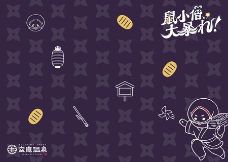 鼠小僧のミニキャラクターをあしらい、見た目にも楽しいメニューとして展開します。バーガーの真ん中に命中した手裏剣は、ランチョンマットに描かれた鼠小僧がこっそり仕掛けたサプライズです。ドリンクをデコレーションするラベルやストロータグまでキャラクター尽くしで、手にした瞬間からワクワク感が広がります。