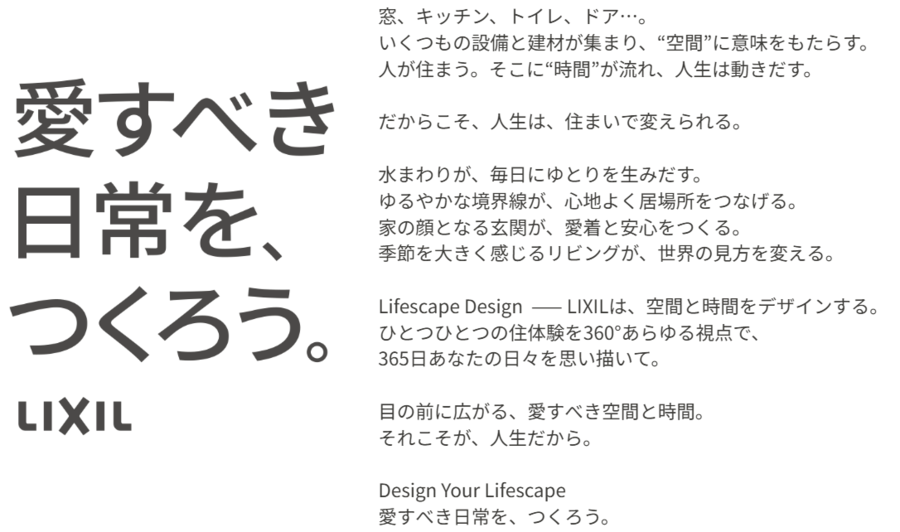 LIXILは、空間と時間を掛け合わせて住体験をデザインしていくことを「Lifescape Design」と称し、Lifescape(暮らしの情景)をDesignするブランドへと進化していきます。「愛すべき日常を、つくろう。」というスローガンには、日常の何気ない瞬間をもっと愛すべき時間に変え、その積み重ねで人生を豊かにしていく、それをお客さまやプロユーザーの皆さまと共につくっていきたいという想いが込められています。今回公開したムービーとビジュアルでも、LIXIL製品がもたらす「愛すべき日常」の何気ない瞬間の大切さや、豊かな住体験の価値を表現しています。LIXILが描くこれからの住まい、そして新たなブランドの歩みに、ぜひご注目ください。