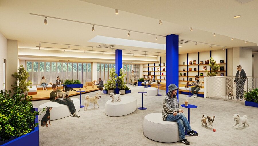 リードフリーでイヌとヒトがゆったりと過ごせる室内ラウンジ空間。