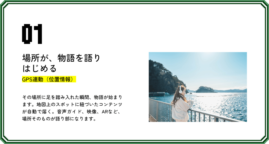 本サービスでは、モビリティと専用アプリを組み合わせ、設定エリア内のあちこちで音声ガイドやプロジェクションマッピング、サイネージ映像などのコンテンツと連動。観光客がWEBアプリをセッティングした端末を持ってエリア内を回ると、近づいた観光名所やおすすめスポットを紹介する音声ガイドが流れたり、プロジェクションマッピングなどの演出が起動したりする仕組みです。
