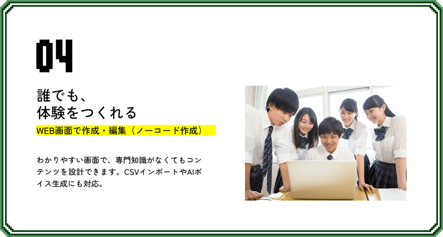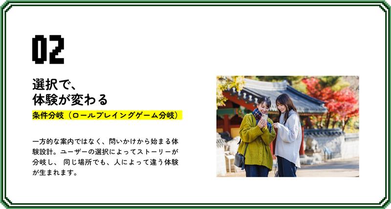 季節や時間、天候、また指定スポットに近づいた回数やルートなどによって演出コンテンツを変えることも可能。これにより、季節や天候などに合わせて誘致する場所を変えられるほか、同じ場所でも毎回異なるコンテンツが楽しめることで観光客に回遊を促します。
