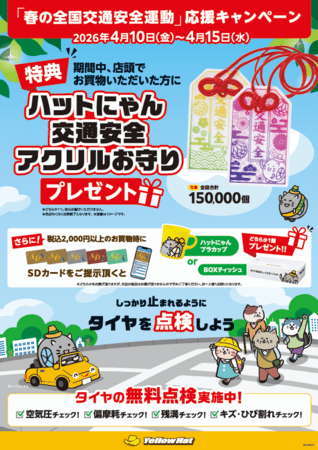 カー用品専門店のイエローハットを全国展開する株式会社イエローハット(代表取締役社長:木村 昭夫)は、2026年4月6日(月)から15日(水)まで実施される内閣府推進「春の全国交通安全運動」に合わせ、交通事故防止を啓発するキャンペーンを4月6日(月)より実施いたします。