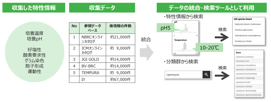 NBRC※2オンラインカタログ(約21,000件の株情報を収載)、JCMオンラインカタログ(約9,000件)、JGI GOLD(約14,000件)、BV‑BRC(約14,000件)、TEMPURA(約9,000件)など、複数のデータベースに収載されている微生物株情報約67,000件から、培養温度や培養pH、酸素要求性など7種類の特性情報を、微生物種ごとに整理・統合することで、日本語による微生物の選定や培養条件の検討を支援するデータベースを構築しました。特性情報から微生物種を検索できる統合データベースは、国内初※3となります。