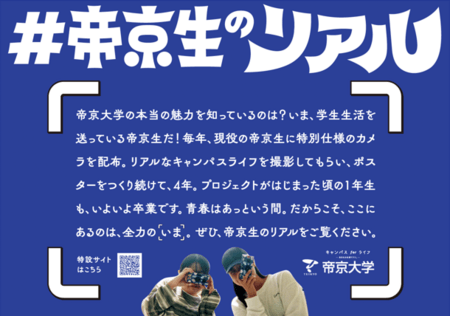 学校法⼈帝京⼤学(本部:東京都板橋区、理事長・学⻑:冲永佳史)は、本学学生がカメラマンとなって撮影した写真を使った「#帝京生のリアル」をInstagram(@teikyo_photo_project)で投稿しています。また、4月6日(月)より写真を使った交通広告を京王新宿駅 中央地下連絡道で掲出します。今年で4年目を迎える「#帝京生のリアル」では、帝京大学の本当の魅力を伝えるために、本学のことを最もよく知っている在学生に特別仕様のカメラを配布、リアルなキャンパスライフを撮影してもらう試みを実施。実際に撮影された写真を使った22種のグラフィック広告が完成。グラフィック広告は八王子キャンパス、福岡キャンパスやそれぞれのキャンパス周辺でも今後展開していく予定です。