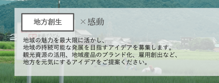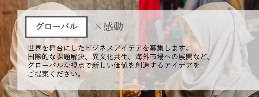 世の中の解決したい社会課題を自由に選定し、当社グループのビジネス上で収益性を維持しながらも、課題解決を図る「持続可能なビジネス」を企画いただきます。5つの企画カテゴリーのうち、いずれかを選択しご応募いただきます。