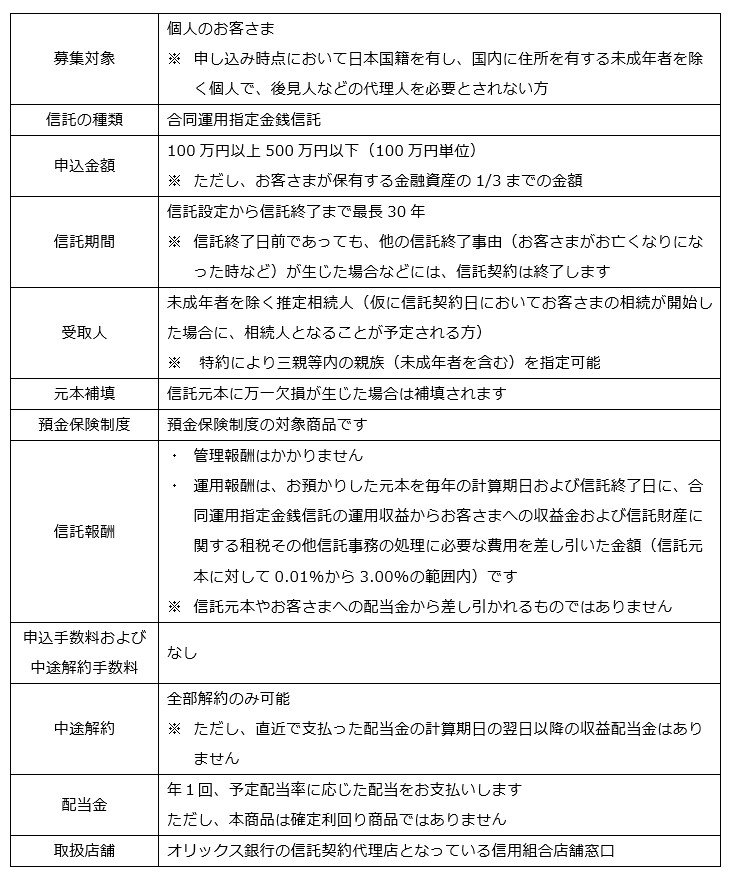 信用組合は、この商品に係る信託契約の締結の代理は行わず、締結を媒介します。ご契約に際しては、お客さまとオリックス銀行(所属信託兼営金融機関)が契約の当事者となります。信用組合は、お客さまからこの商品に係る財産の預託を受けることについて、オリックス銀行から権限の付与を受けています。