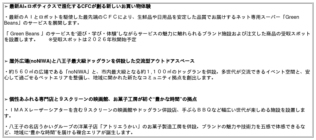 「North」(A街区) は、最新AI×ロボティクスで進化するイオンネクストのCFC、「South」(B街区)は、IMAX®レーザーシアターを含む9スクリーンの 映画館に加え、お菓子作りを体験できる工房や大規模ドッグランの併設店舗など、地域に根差した賑わいの場を創出することをめざしてまいります。