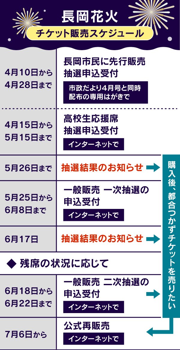 日本三大花火に数えられる「長岡まつり大花火大会」(長岡花火)が今年も8月2日と3日、長岡市で開かれます。人気と知名度は今や全国トップクラスで、昨年は約34万人分のチケットが事前に完売したほか、チケットを不正に転売したとして逮捕者が出ました。4月10日からの市民先行販売を皮切りに、今年もチケット販売が始まります。入手するには事前の情報が欠かせません。このページでは長岡花火の概要やチケットの入手方法などを詳しく紹介します。