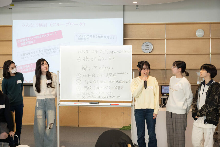 ワークショップの後半で行われたプレゼンテーションでは「子どもが親の言うことを聞いてくれない」といった悩みから、親子間の約束ごとを可視化し、スタンプなどで進捗を共有できるアプリ「コネペア」というサービスが提案されるなど、高校生ならではの柔軟な発想からたくさんのアイデアが発表されました。