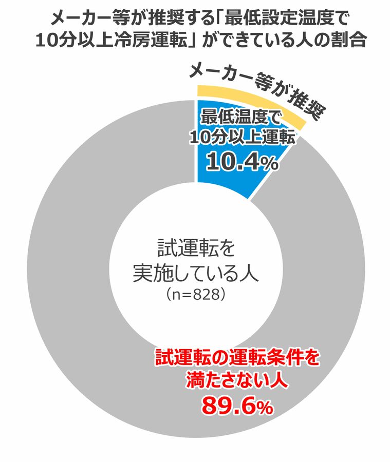 エアコン試運転方法を聞いたところ、推奨方法である「最低設定温度」で「10分以上の冷房運転」を実施している人は、わずか10.4%で89.6%の人が「したつもり試運転」であることが明らかになりました。