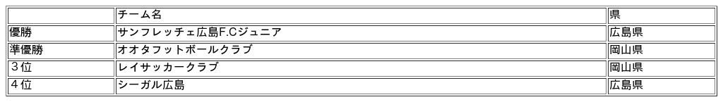2日間にわたり全24試合が行われ、サンフレッチェ広島F.Cジュニア(広島県)が優勝しました。優勝したサンフレッチェ広島F.Cジュニア(広島県)と準優勝したオオタフットボールクラブ(岡山県)の2チームが、5月3日(日・祝)~5日(火・祝)に神奈川県の日産スタジアムで開催される決勝大会へ出場し、小学生日本一を目指します。