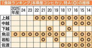 2月に発表された2025年産米の食味ランキング(日本穀物検定協会主催)で、新潟県産銘柄で最高の「特A」だったのは3年連続で魚沼コシヒカリのみだった。近年、全国的に高温耐性品種の特A評価が増えている中、特Aを逃した県内産地は主力品種であるコシでの返り咲きを目指す。一方、すでに新潟県コシは「トップブランド」として市場に浸透しているとして、評価を冷静に受け止める関係者もいる。(報道部・山本司)