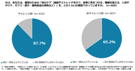 ● 非チャレンジ層で週1回以上ケアを行っているのは65.2%にとどまり、22.5ポイントの差