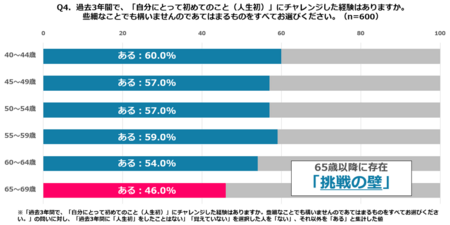 ● 40代前半の「人生初」への挑戦経験率は60%と最も高く、50代も57〜59%と高水準を維持
