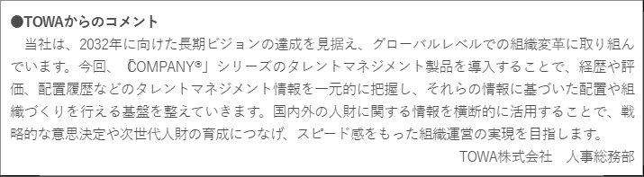 株式会社WHI Holdings(本社:東京都港区、代表取締役最高経営責任者(CEO):安斎富太郎)は、TOWA株式会社(本社:京都府京都市、取締役社長執行役員:三浦宗男、以下 TOWA)が統合人事システム「COMPANY®」のタレントマネジメント製品「COMPANY® Talent Management」シリーズ(以下 CTM2.0)を採用したことをお知らせします。