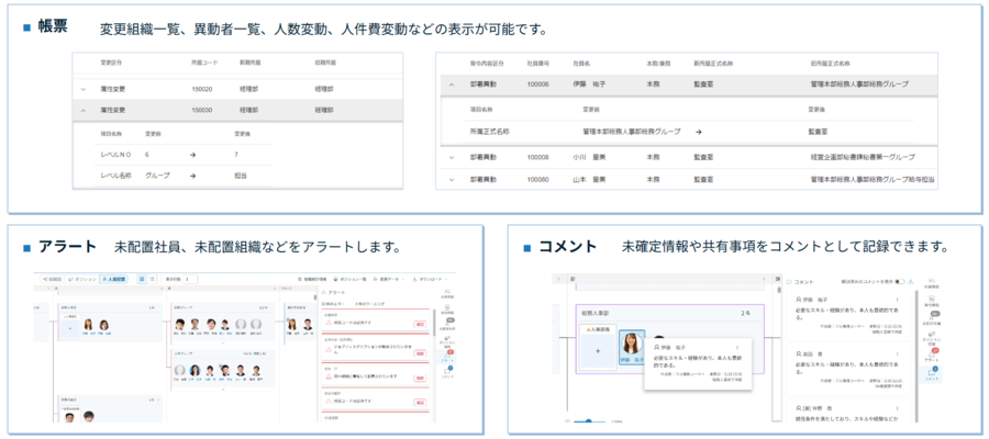 実務運用面においても、組織原案の作成から、組織図の参照・検索・メンテナンス、画面上での人員配置シミュレーション、関係者との共有や共同編集に至るまで、一連の業務プロセスをCTM2.0上で完結させることで、組織・異動検討業務の効率化を図っていく考えです。