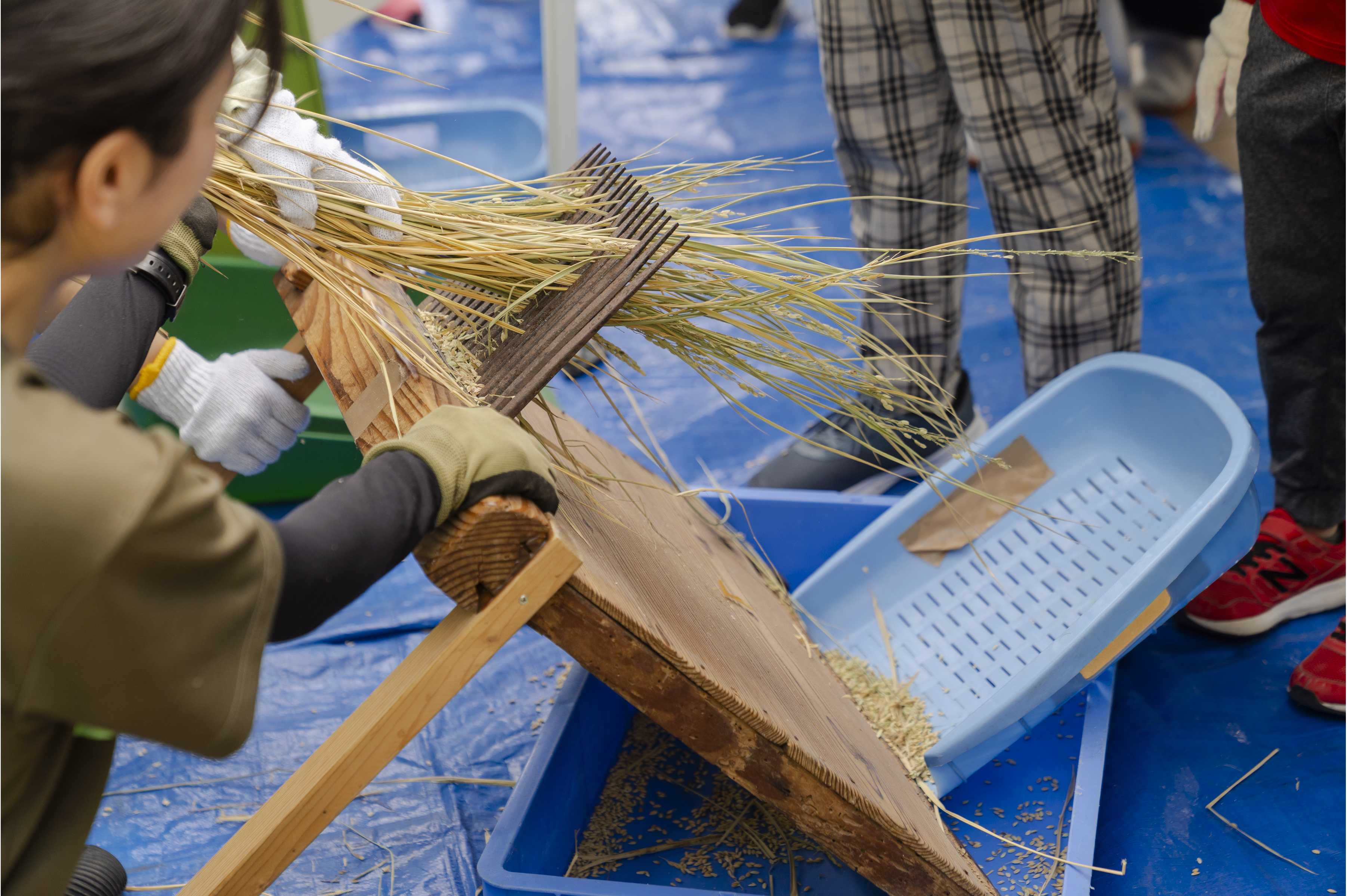 稲を千歯こきや唐箕(とうみ)を使い、もみ殻・玄米などに選別します。昔ながらの機具を使用し脱穀・精米をすることで、力のいる作業を体験できます。精米したお米はプレゼントします。