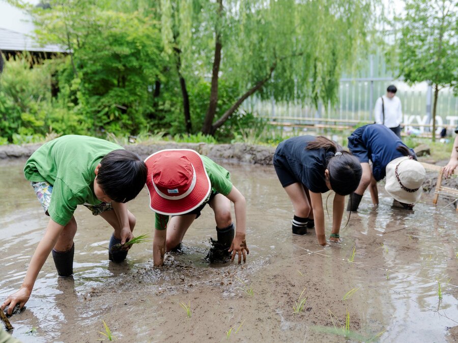 お米に関するクイズや説明をした後、水を張った田んぼに入り、稲の苗を手作業で植えていきます。飼育スタッフや農家さんが植え方をレクチャーします。