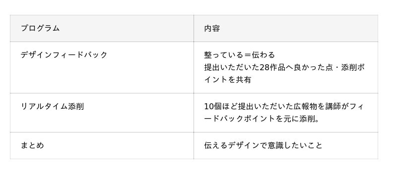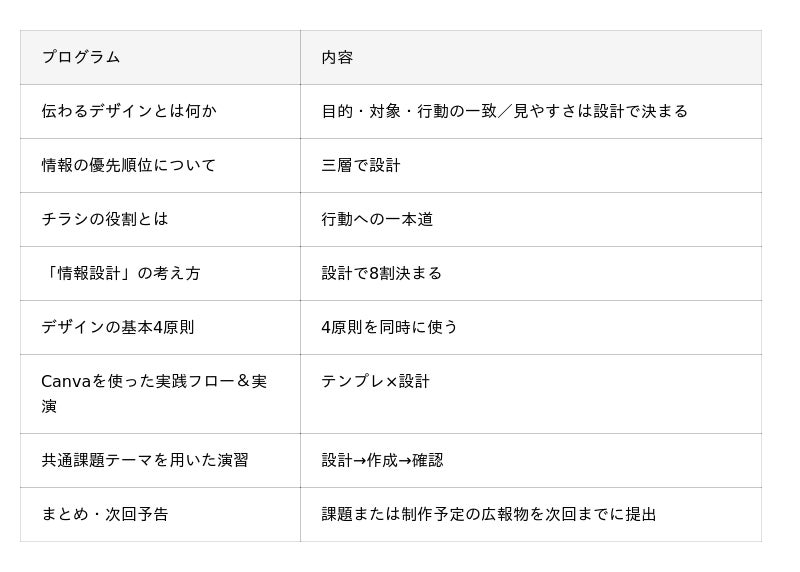 また、実演・演習を交えながら、広報物の設計から制作までの流れを理解し、実務への活用イメージを深めました。