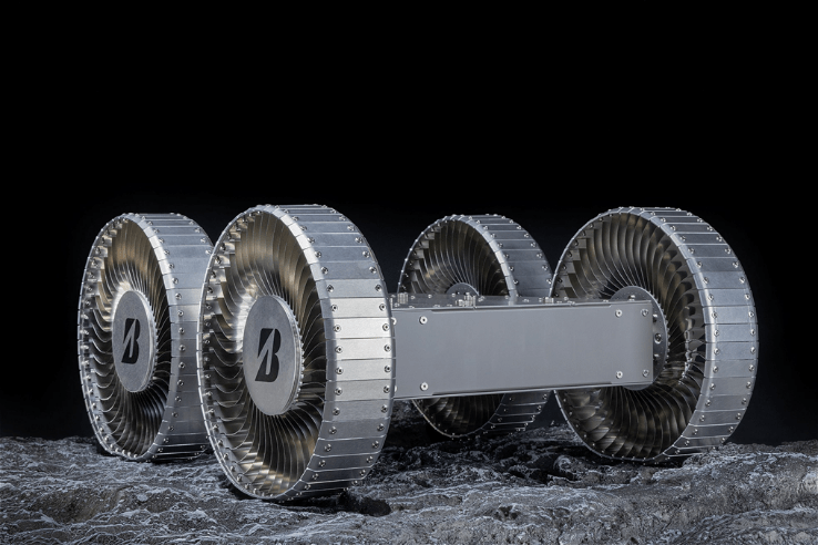 ブリヂストンが展示予定のモビリティに装着された月面探査車用タイヤのコンセプトモデル