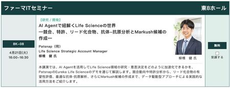 私どものブースでは、創薬研究から承認・市場展開に至るまでのプロセスを一貫して支援するAIエージェント「Patsnap Eureka」をご紹介しております。また、4月21日(火)16:00〜16:30の講演では、AIエージェントの活用によるライフサイエンス領域における研究および意思決定の高度化・迅速化について解説いたします。競合動向・特許分析を起点に、リード化合物の有望性評価、抗体‐抗原解析、さらにはMarkush候補の設計に至るまで、一連の実践的な活用アプローチをご紹介いたします。ぜひ弊社ブース「8H-10」にお立ち寄りいただき、最新のAIエージェントをご高覧いただけますと幸いです。