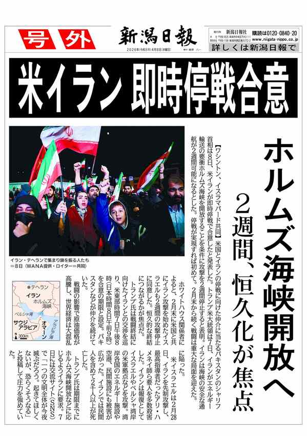 【号外】米イラン即時停戦合意 2026/4/8 10:51 (最終更新: 2026/4/8 10:51) PDFで号外を見る トップページで最新情報を見る 関連ニュース 【号外】センバツ高校野球、日本文理8強ならず 3/25 【号外】帝京長岡初戦敗退 3/23 【号外】センバツ高校野球、日本文理初戦快勝 3/21 【号外】新潟水俣病8人全員認定、新潟地裁判決 3/12 【号外】旧統一教会に高裁が解散命令 3/4 【号外】米、イスラエル両軍がイラン攻撃 2/28 【号外】フィギュア女子で中井亜美(新潟市出身)が「銅」! 2/20 【号外】フィギュアペア・りくりゅう金メダル!日本勢初 2/17 【号外】スノボ男子HPで戸塚が金、山田が銅、平野(歩)は7位 2/14 【号外】スノーボード女子ビッグエアで村瀬心椛が「金」 2/10 【号外】スノーボード男子ビッグエアで木村葵来が金、木俣は銀 2/8 【号外】センバツ高校野球、帝京長岡と日本文理が出場決定! 1/30