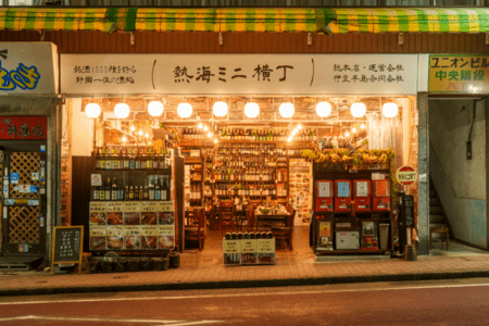 「熱海ミニ横丁」は、食と酒だけでは終わらない居酒屋として、他にはない独特の存在感を放っています。店内に足を踏み入れた瞬間、まず目に飛び込んでくるのは、1,000種類を超える酒が並ぶ圧巻の“酒の壁”です。しかし、この店の魅力は酒の数だけではありません。店内空間そのものが、ここでしか味わえない体験価値を生み出しています。