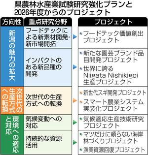 農業総合研究所(長岡市)など県の研究機関ではこれまでも農林水産業や食品産業に関わる研究をしてきたが、中長期的かつ戦略的に研究に取り組むために研究強化プランを策定した。