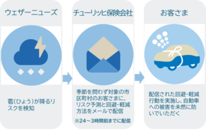 本サービスは、ウェザーニューズ社の気象データ提供サービス「WxTech(R)」の「ひょうリスク予測API」のデータをもとに、ひょうの発生が予測される市区町村にお住まいの対象ご契約者さまへ、被害発生前に注意喚起のメールを配信します。