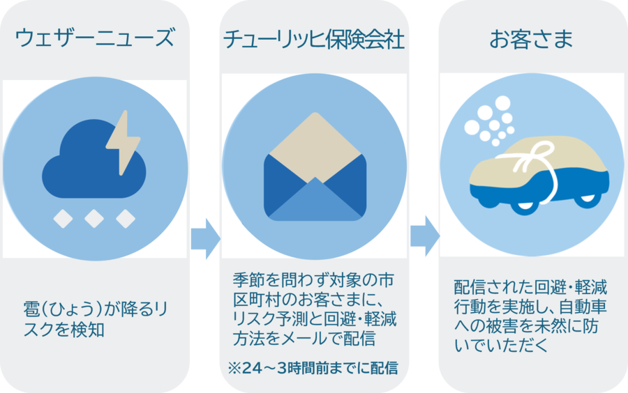 チューリッヒ保険会社(東京本社:東京都中野区、日本における代表者および最高経営責任者:西浦 正親、以下「チューリッヒ」)は、株式会社ウェザーニューズ(本社:千葉市、以下「ウェザーニューズ社」)のひょうリスク予測データを活用し、ひょうが降るリスクが高まった際に、対象の地域のお客さまへメールでお知らせする「雹(ひょう)アラート」のサービスを2026年4月1日より提供開始しました。