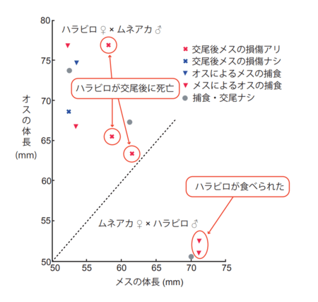 図2. ハラビロとムネアカの交尾実験の結果。ハラビロのメスは交尾による交尾器の損傷が大きく、ハラビロのオスは食べられやすい。